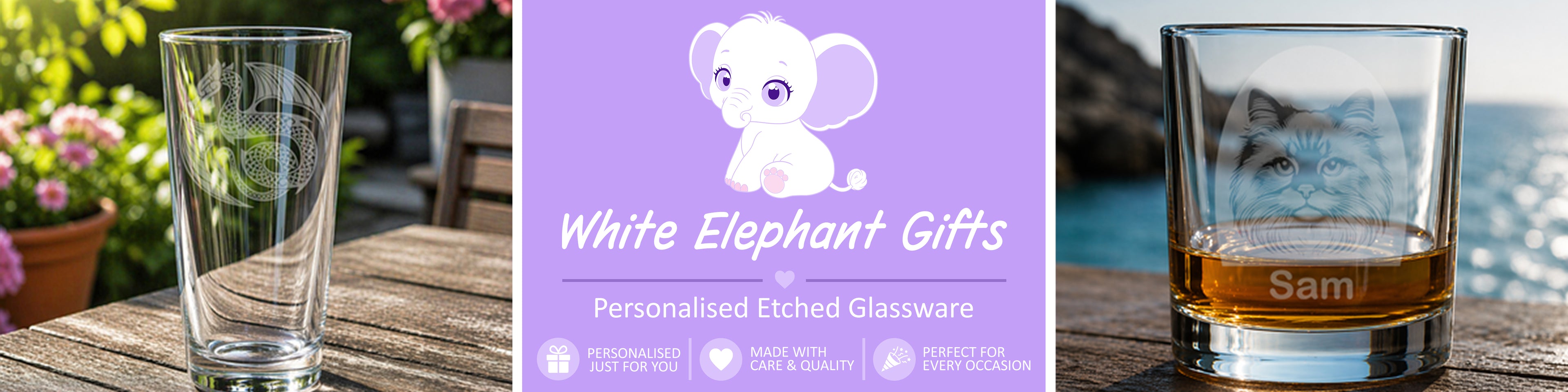 At White Elephant our goal is to find different ways to personalise glass to create bespoke gifts. We started off with a small selection of etched glass designs using a chemical etching method. Demand has grown steady and we now use a CO2 laser etching system which offers a better finished product and provides a faster turn around for our customers.