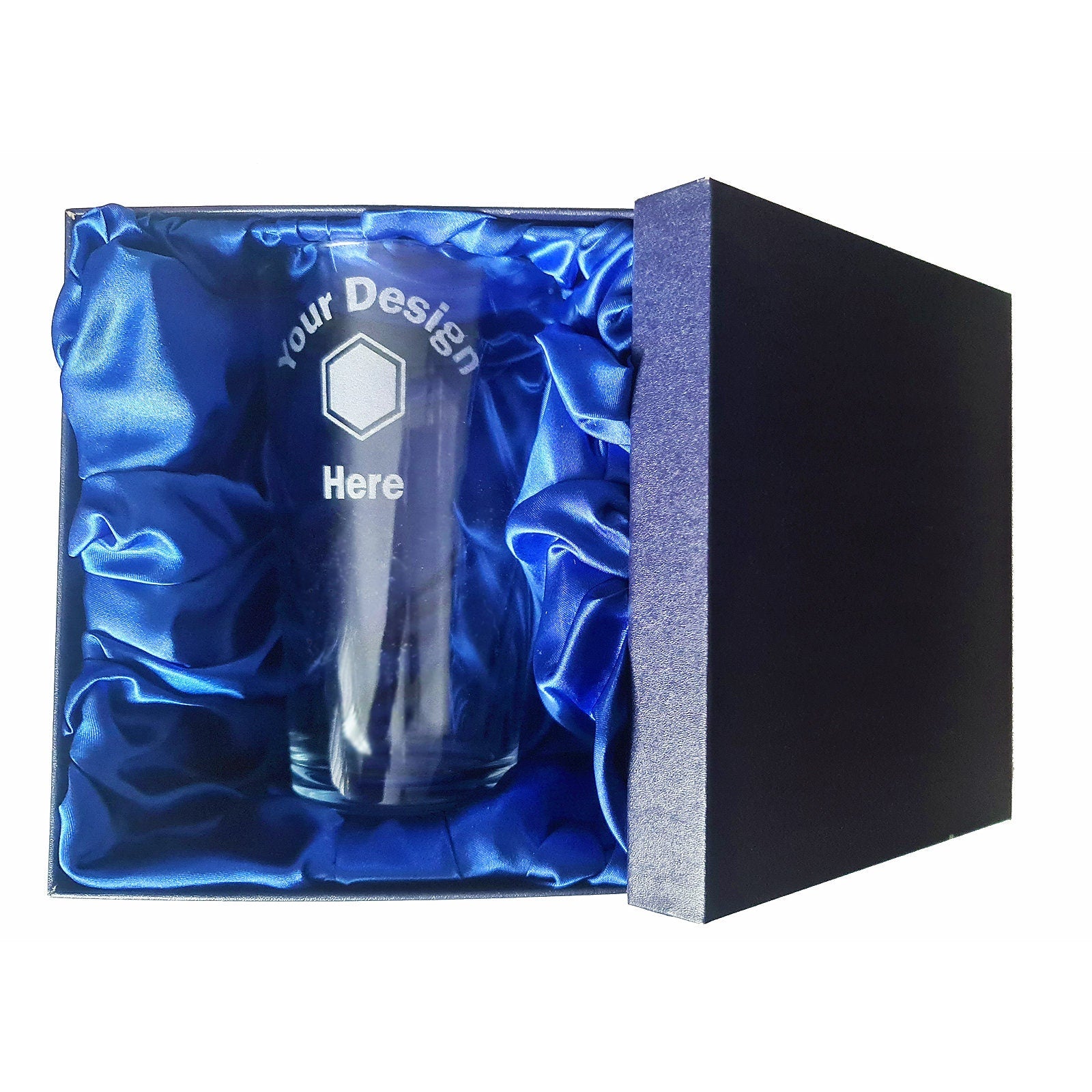 Our blue silk gift boxes are great for gifting with a glass for a special occasion. We have different box options to fit single Whiskey Glasses, double Whiskey Glasses, Single Tankard Glasses, Single Highball and single Pint Glasses. These perfectly fit the personalised glasses we have for sale on our shop. The gift boxes will be sent out in a plain brown packing box.